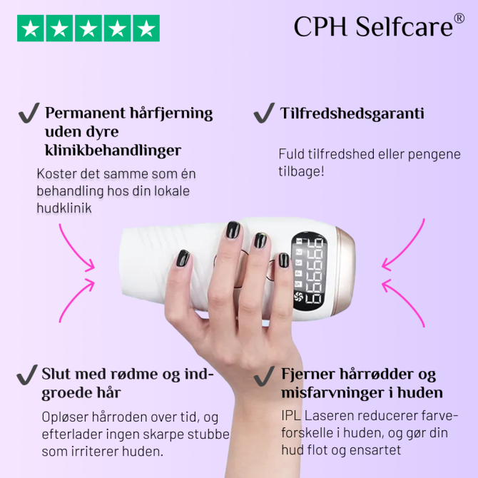 Hos CPH Selfcare tilbyder vi en 30 dages risikofri prøveperiode for alle, der investerer i deres første Krystal Hårfjerner. Hvis du ikke er tilfreds med produktet efter 30 dage, får du alle dine penge retur. Vi ønsker at give alle mulighed for at opleve en nemmere, hurtigere, sundere og sjovere måde at fjerne hår på.